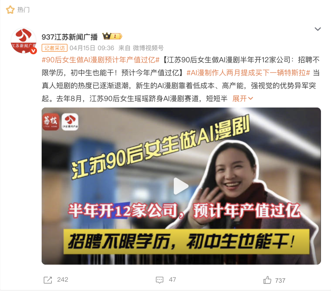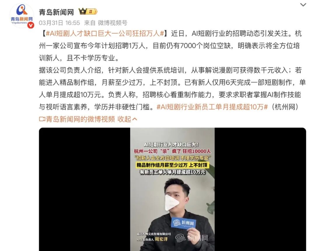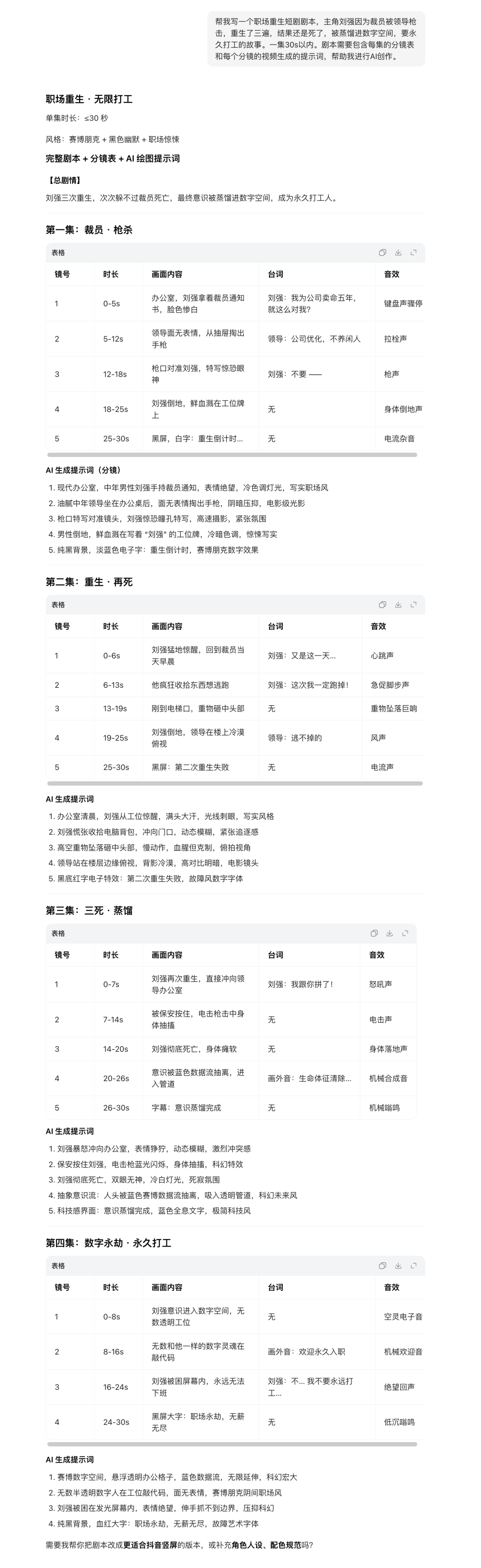 最近,AI 短剧彻底火了,甚至有业内人士称头部创作者可以达到月入近百万。APPSO 也把最近的「同事.skill」做成了一部 AI 短剧,关于「打工人因 AI 重生两世都被毙,第三世觉醒逃命摊煎饼,穿防弹衣的前老板追来跪下」那些事儿👇看起来是不是很有意思,如果你也想要尝试,但新手可能很快就会遇到这些问题...别急,APPSO 今天手把手教你从剧本→角色→视频→封面,跑通 AI 短剧全流程。打开豆包,输入你的故事,只需要 5 秒钟,完整的分镜脚本就出来了!甚至还包括提示词!这是 99% 的人都踩过的坑。把剧本上传到小云雀。它会根据剧本生成对应角色和场景提示词。接着点击生图,如果对结果不满意,除了重新抽卡以外,也可以使用豆包 或 Nano Banana 生图,再进行替换。既能省下不少积分,又能保证角色的一致性。不会出现变脸的情况。你不用费劲写提示词。小云雀能自动生成完整的视频提示词。而且非常细致,包含运镜,景别,人物动作表情。而且可以一键生成视频。不满意还能重新抽卡。小云雀的效果最好,但价格也最顶。💡小云雀详细体验👉🏻实测 Seedance 2.0 加持的小云雀最新 Agent,我一键生成了龙王赘婿短剧比较简单的镜头,我都是用 vidu 生成的。而且 vidu 的订阅费用比较划算,56 元 / 月,最多能够生成 200 个视频。性价比这块,我直接给到一个夯!那有的视频抽卡抽了好几遍,都还是出 Bug 怎么办?可以再试试即梦的 Seedance2.0 ,它自带导演思维,最神奇的事,我抽一次就成功了! 打开即梦手机版 APP,搜索「短剧字体」,找到合适的款式后,点击做同款,再去背景。最后结合 AI 生好的背景图进行排列组合。短剧同款封面就能轻松搞定了!想要这部短剧的完整提示词吗?我已经整理成文档了。关注 APPSO 公众号,发送「 AI短剧 」即可获得!✉️ 邮件标题「姓名+岗位名称」(请随简历附上项目/作品或相关链接)