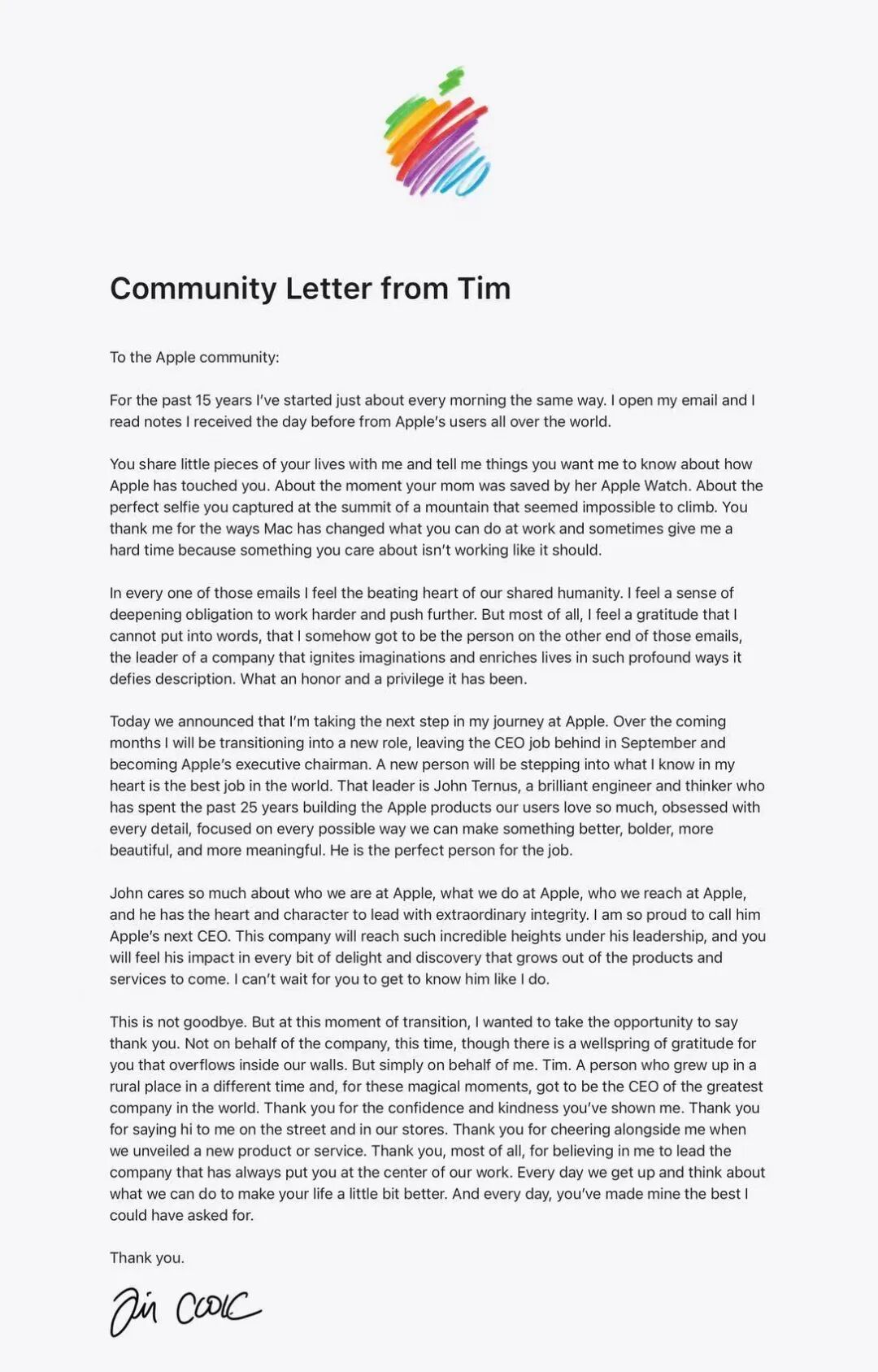 即将卸任 CEO 的库克,也在今天向全球苹果用户发布了一封感谢信,感谢用户在他 15 年的任期之中每天分享自己使用苹果产品的生活点滴。