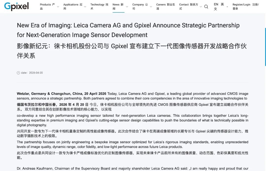 国产 CMOS 图像传感器供应商长光辰芯(Gpixel)昨日与徕卡正式宣布战略合作,双方将联合为下一代徕卡相机定制开发一款高性能 CMOS 图像传感器芯片。据悉,此次合作将整合徕卡在高端成像领域积累多年的专业经验,与长光辰芯领先的 CMOS 图像传感器设计能力,打造定制化芯片,精准匹配徕卡相机在色彩还原、噪声优化、动态范围及细节呈现上的严苛标准。双方还将在芯片验证、图像调校及量产准备等方面密切协作,覆盖从研发到量产的完整链条。来自德国韦茨拉尔、比利时安特卫普和中国长春三地的工程技术团队将参与其中。福特 CEO:选择试驾小米 SU7 是因为特斯拉「没有更新的车型」