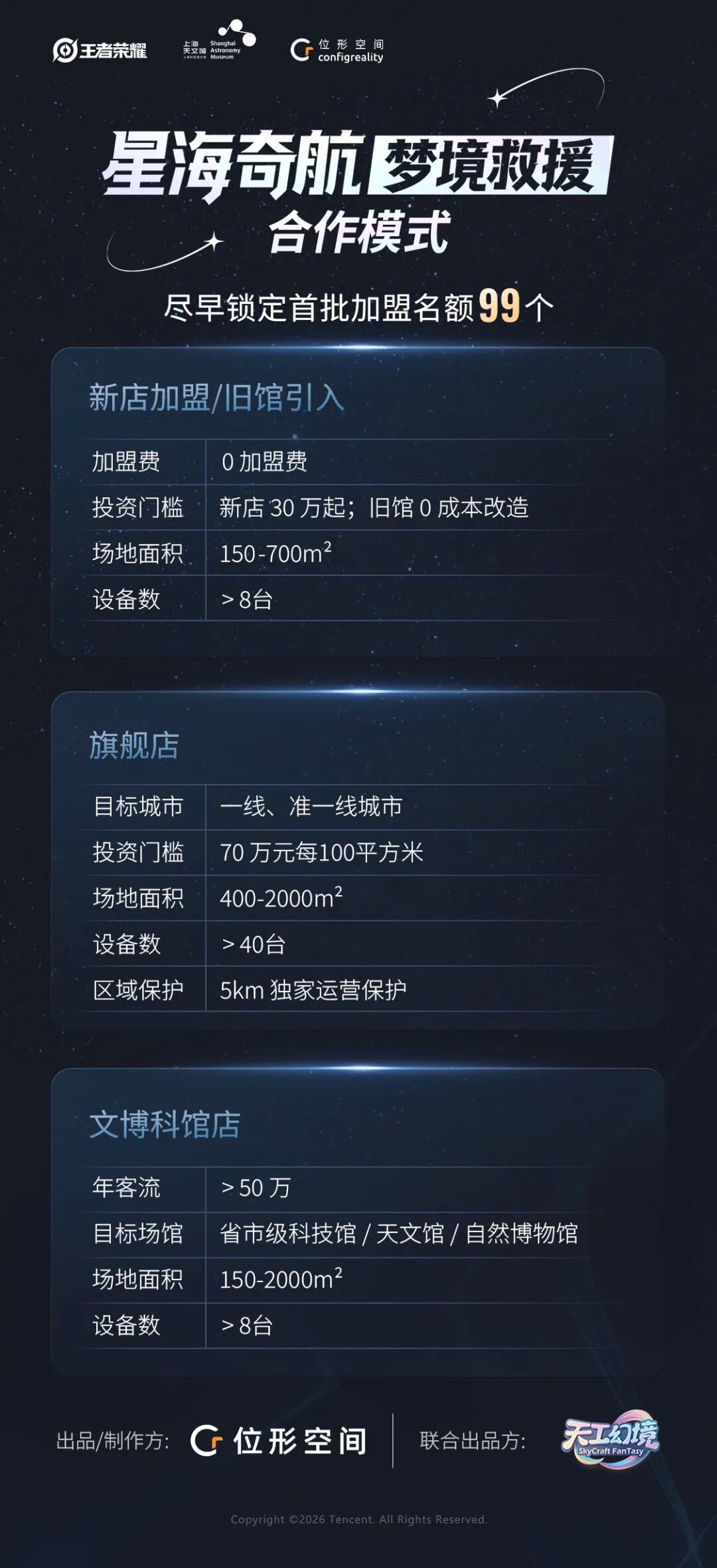 即日起,《星海奇航:梦境救援》已启动“0加盟费”全国招商计划,店型分为旗舰店、加盟店(新店加盟+旧馆引入)、文博科馆,匹配不同的营销支持层级以及业态组合权限,可轻可重,按需接入。