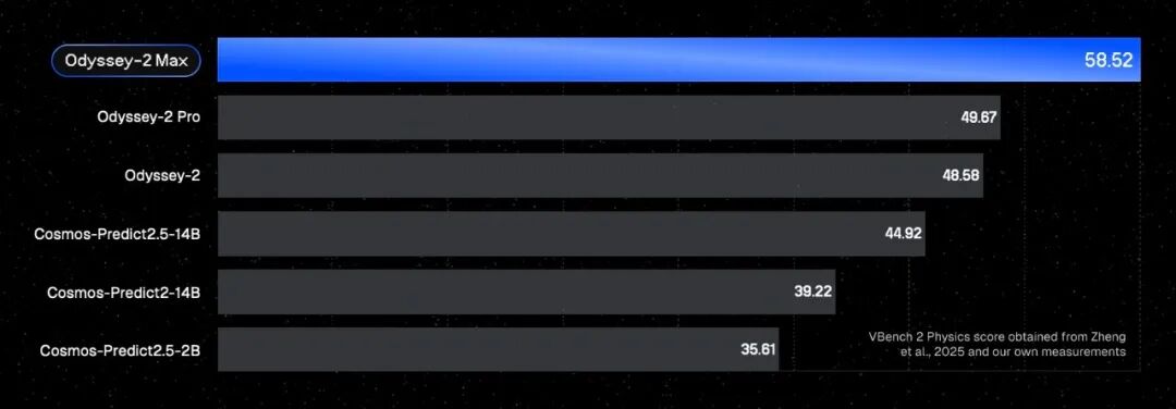 Odyssey 昨日发布了旗下最新通用世界模型 Odyssey-2 Max,参数量为前代 Odyssey-2 Pro 的 3 倍,训练计算量提升 10 倍。与 Sora、Veo 等视频生成模型不同,Odyssey-2 Max 能够根据用户的实时操作逐帧生成画面,而非提前生成固定视频,用户可以像玩游戏一样与模拟世界实时互动,且画面可持续生成超过 120 秒而不崩溃。在物理仿真准确度上,Odyssey-2 Max 表现领先同类:VBench 2 物理得分 58.52,高于 Odyssey-2 Pro(49.67)和英伟达 Cosmos-Predict2.5-14B(44.92)PAI-Bench 物理得分 93.02,同样优于主要竞品Odyssey 由自动驾驶行业出身的 Oliver Cameron(CEO)与 Jeff Hawke(CTO)联合创办,此前累计融资 2700 万美元。支付宝 AI 付接入「龙虾」平台