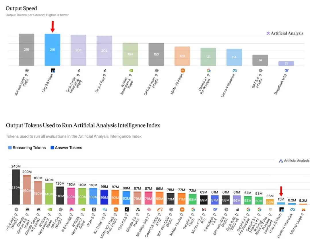 昨天,蚂蚁百灵正式发布 Ling-2.6-flash,总参数量 104B、激活参数 7.4B,主打「Token 效率(Token Efficiency)」,定位高效落地场景。值得一提的是,早在一周前,该模型的匿名测试版本「Elephant Alpha」便已上线 OpenRouter,连续多日位列 Trending 榜首,日均 tokens 调用量达 100B 级别,周增长超 5000%。Token 效率:在 Artificial Analysis 完整测评中,总消耗仅 15M tokens,约为 Nemotron-3-Super 的 1/10,同时实现 26 分 Intelligence Index;推理速度:4 卡 H20 条件下最快达 340 tokens/s,Output Speed 测评中以 215 tokens/s 位列同参数级别第一梯队;AI 智能体能力:在 BFCL-V4、SWE-bench Verified 等主流 AI 智能体基准上达到同尺寸 SOTA 水平;定价:API 输入每百万 tokens 0.1 美元,输出 0.3 美元,现提供一周限时免费试用。Odyssey 发布最强世界模型 2 Max