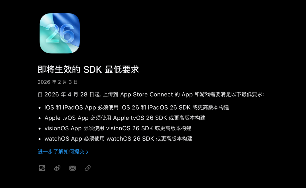 每年除了新系统,苹果还会发布对应的 SDK,并限制一个明确的日期,要求所有应用必须使用新 SDK 才能上传 App Store。