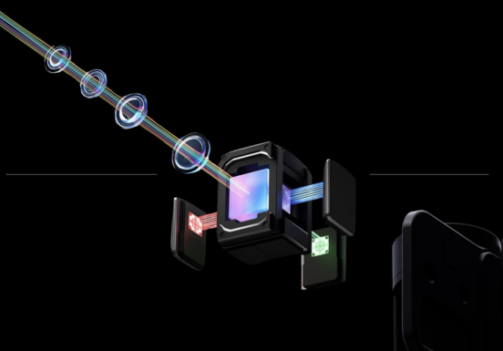 合色方案主要通过 RGB 三块单色 Micro-LED 面板配合 Cube 棱镜组合实现全彩。该方案的优势在于技术相对成熟、已率先步入量产,并在早期全彩 Micro-LED 产品中承担了重要角色,是产业迈向全彩阶段的关键过渡方案。但合色方案局限性也相对明显,必须在物理空间上极其精确地对准三个屏幕的光路,整体加工难度大,且光源穿过棱镜会有不可避免的光损耗,同时三个屏幕的设计也使得光机体积难以进一步实现微缩。