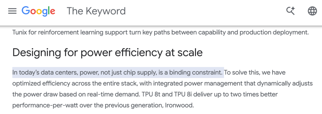 就连谷歌自己的高管也说:在今天的数据中心里,真正卡脖子的不只是芯片,还有电。
