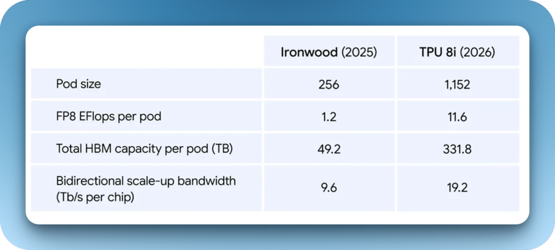 在推理芯片 8i 上,它的 288 GB HBM 显存配 8.6 TB/s 带宽,显存比 8t 还多 72 GB、带宽还高三成。它还配备了 384 MB 的片上 SRAM,是上一代 Ironwood 的 3 倍。