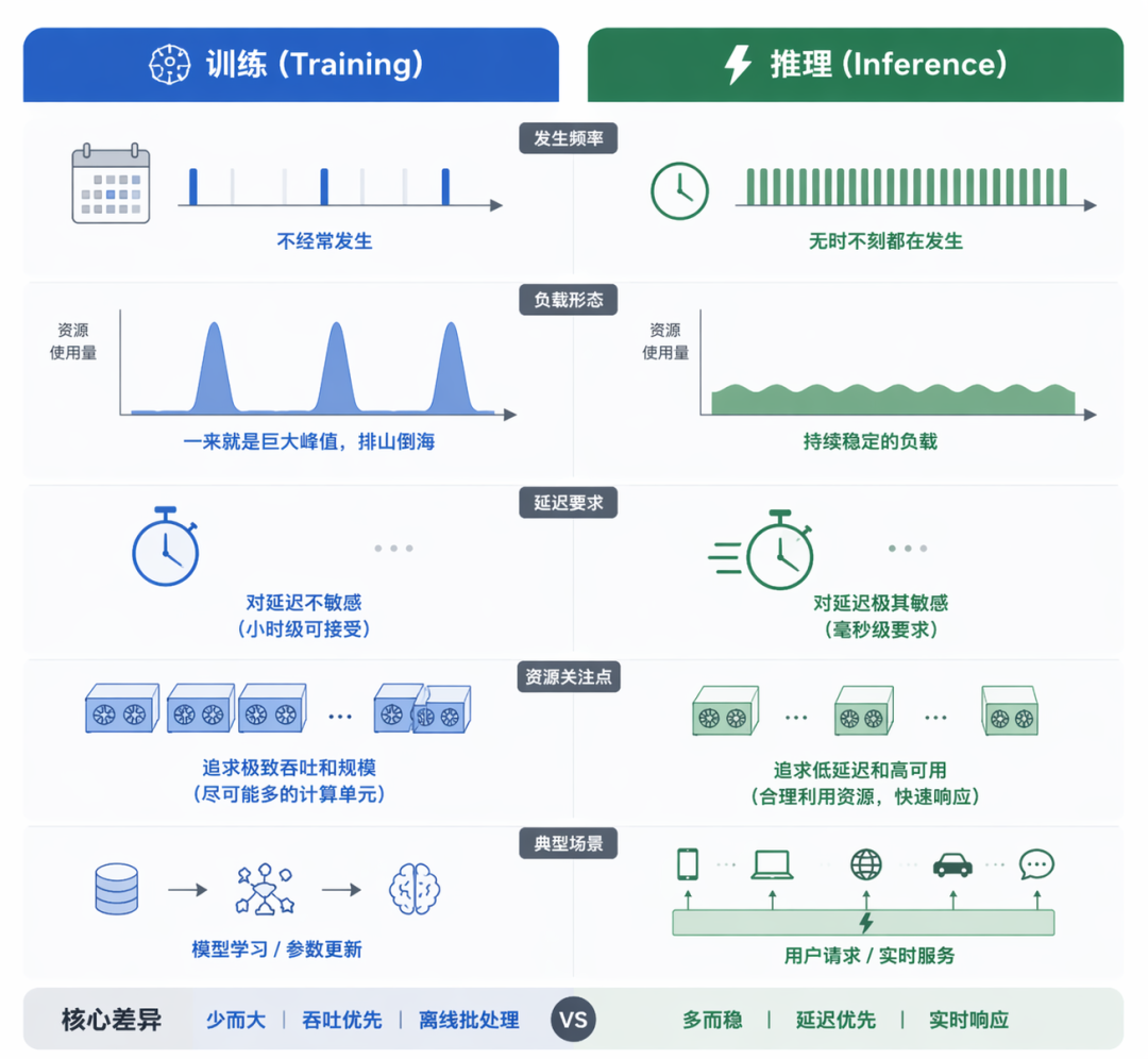 训练任务的算力负载,可以理解为「大洪水」:不经常来,但一来就是排山倒海的流量。一次前沿模型训练持续数周,横跨万卡规模,对单芯片峰值和故障域规模很敏感。