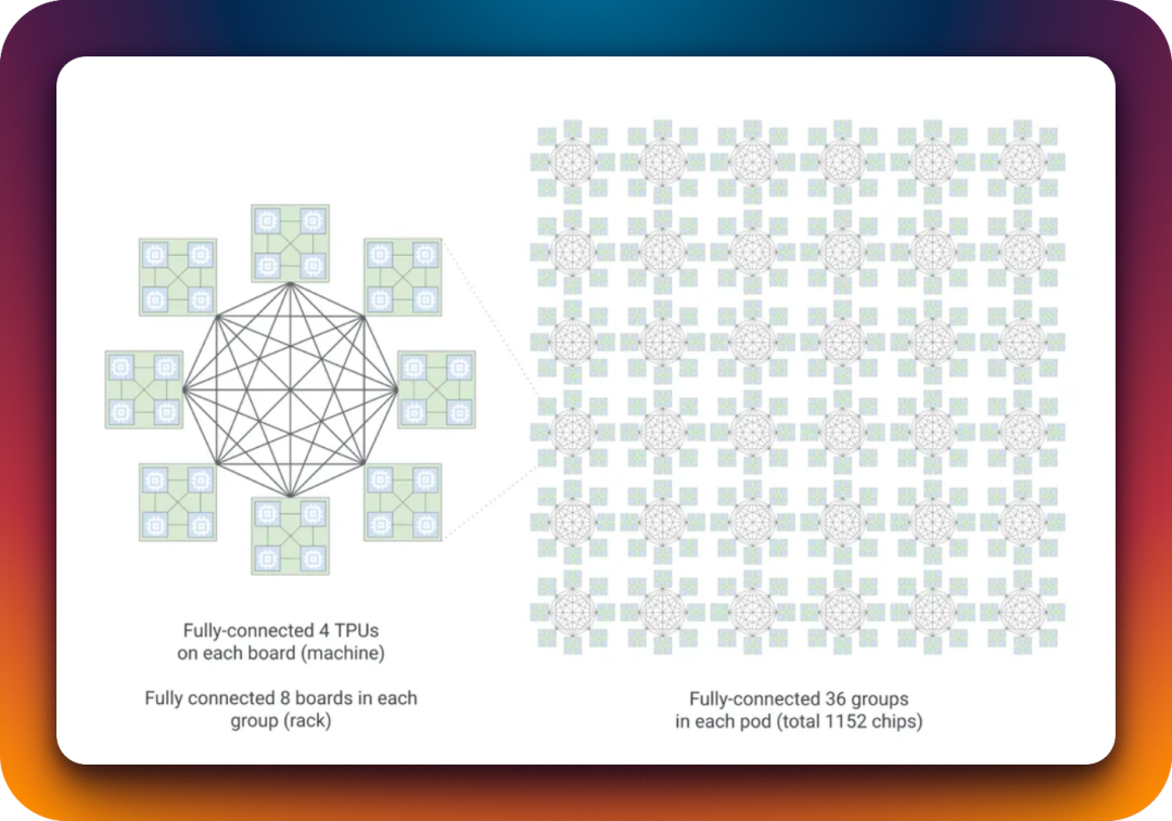 8i 换上的新拓扑叫做 Boardfly。简单说,4 颗芯片组成一个小单元,8 块板拼成一个组,36 个组再通过光开关连起来,按照 1024 枚芯片的最高集群数量来计算,两颗最远芯片之间的跳数可以从 3D Torus 的 16 跳压到 Boardfly 的 7 跳,网络直径减少 56%,通信延迟最多降一半。