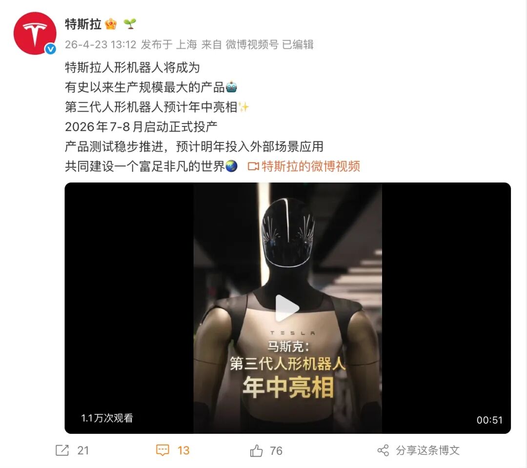 昨天,特斯拉官方发文称,旗下第三代人形机器人预计年中亮相,将于今年 7-8 月启动正式投产,产品测试目前稳步推进,预计明年投入外部场景应用。特斯拉同时表示,人形机器人将成为其「有史以来生产规模最大的产品」。今年 1 月 29 日,特斯拉在发布 2025 年第四季度及全年财报时曾表示,第三代人形机器人将于今年第一季度发布;2 月初,特斯拉官方微博也曾宣称第三代机器人「即将亮相」,并称其可通过观察人类行为学习新技能。在产品规划上,第三代版本将在 2.5 代基础上升级,包含最新的手部设计。弗里蒙特工厂的 Model S/X 生产线届时将改造为人形机器人产线,规划年产能为 100 万台。与此同时,特斯拉正在为得州超级工厂筹备第二代生产线,长期设计年产能达 1000 万台。华为乾崑 ADS 5 正式发布:训练效率提升 10 倍,碰撞风险降低 50%