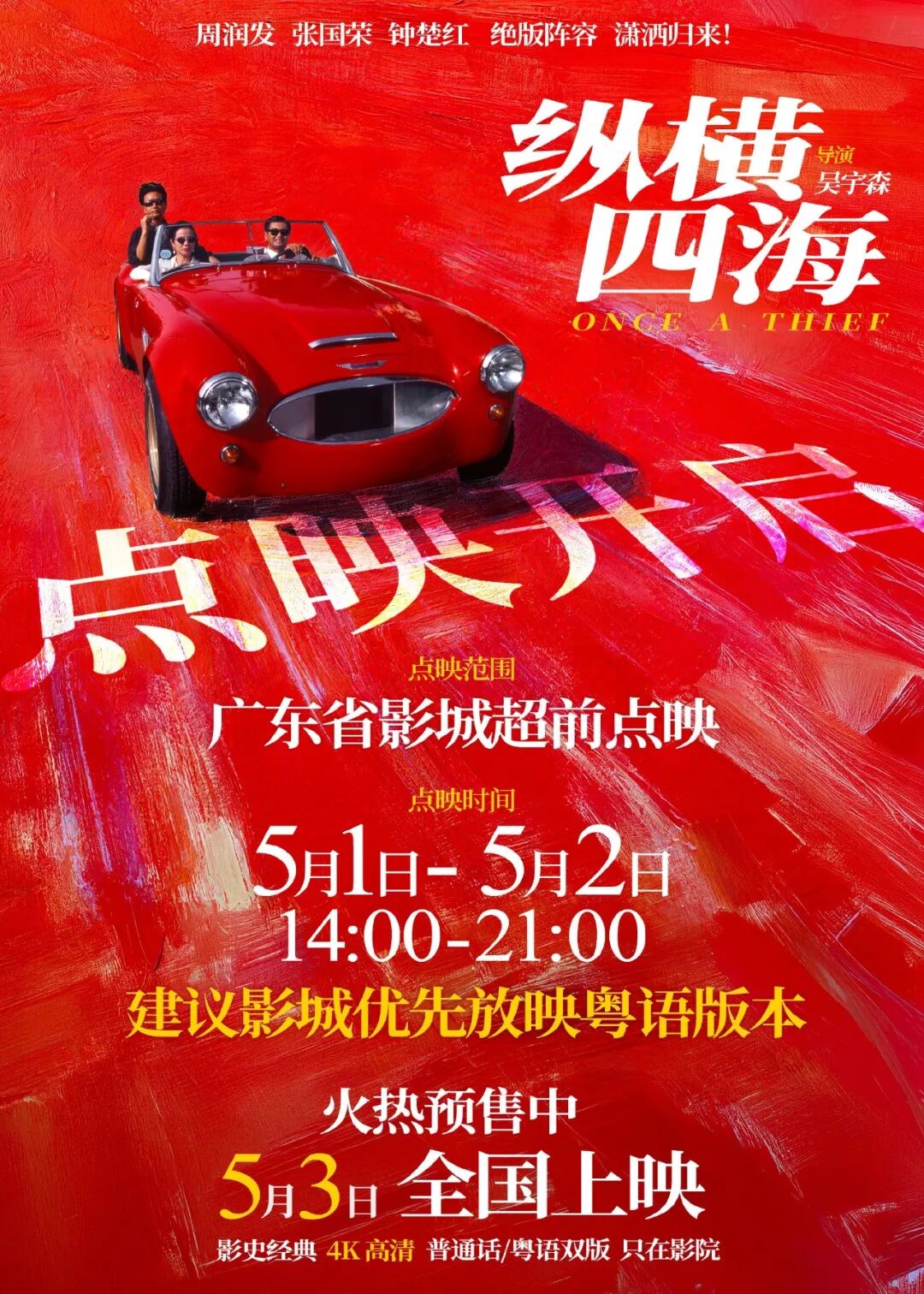 经典港片《纵横四海》4K 高清修复版正式宣布定档,将于 5 月 3 日登陆全国院线。影片还将于 5 月 1 日至 2 日 14:00~21:00 在广东省率先展开点映活动。本片将以普通话、粤语双版本上映。《纵横四海》由吴宇森执导,周润发、张国荣、钟楚红领衔主演,于 1991 年问世,此次内地公映是该片首度登上内地大银幕,距离影片上映已相隔 35 年。影片讲述三位孤儿被养父培养为国际大盗,历经生死、背叛与复仇的故事,将枪战、动作、喜剧、舞蹈等元素融为一体,豆瓣评分 8.8。《福尔摩斯小姐 3》7 月 1 日上线 Netflix