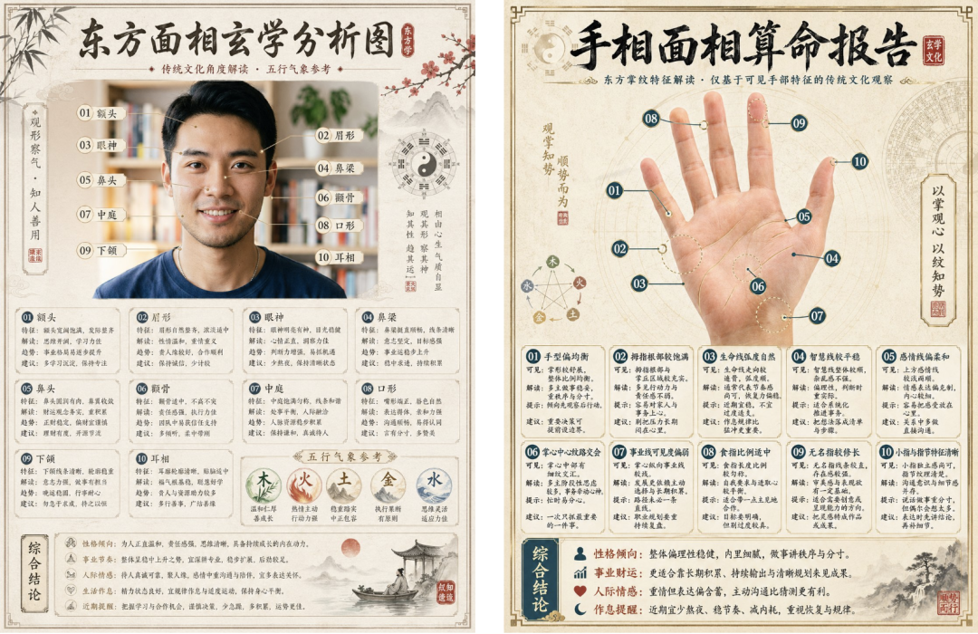 在消耗了无数张 GPU 资源、烧掉了够几座城市用一年的电力之后,OpenAI 最新推出的 AI 生图大模型 GPT-Image-2,再次迎来了它人生中的高光时刻——只要拍一张自己手掌的高清照片发给 GPT-Image-2,再附上一段简单的 Prompt,它就会化身天桥底下的赛博半仙,为你生成一份排版精美、用词考究的掌纹性格与职业指南。这场由 AI 爱好者 Linus Ekenstam 率先发起的趣味测试,迅速演变成全网算命狂欢。连 Reddit 联合创始人 Alexis Ohanian 都没忍住,乖乖把自己的手掌特写交给了 AI。然后心满意足地领走了一个「适合创业的务实理想主义者」高帽标签。a16z 投资合伙人 Justine Moore 也凑了凑热闹。原提示词:based on my hand I want you to make a complete palm reading guide, Analyze the palm, the style of the guide should be clean and minimal, thin lines, rounded cards, overall very expensive looking. Focus on the palm reading, create a simple black on white contour of my main lines, as a little artwork. do your best)(中文翻译:根据我的手掌,我希望你制作一份完整的手相解读指南,分析手掌纹路。指南风格应简洁极简,细线条、圆角卡片,整体呈现高端质感。重点放在手相解读上,用简单的黑白轮廓线绘制我的主要掌纹,作为一幅小插图。请尽力完成。)为了验证这个赛博半仙的成色,立刻给它安排了一波全方位实测。丢一张熬夜打工人的手相过去测一测,好家伙,AI 一本正经地顺着纹路就是一顿猛夸。提示词:根据我的手掌,我希望你制作一份完整的手相解读指南,分析手掌纹路。指南风格应简洁极简,细线条、圆角卡片,整体呈现高端质感。重点放在手相解读上,用简单的黑白轮廓线绘制我的主要掌纹,作为一幅小插图。2K基于同一提示词,再测试一次,解决的结果也大致相同,越看也越符合我对自己的评价,难道这 AI 真是半仙降人间?随手丢一张《熊出没》里的熊大掌纹过去。它照样能煞有介事地一顿乱吹。连物种都不挑了是吧。除了看手相,甚至还有看面相的版本。世界首富马斯克被测出了「理性,克制,稳健」。提示词:根据我的面部照片,制作一份完整的面相解读指南,分析五官与面部特征。指南风格简洁极简,细线条、圆角卡片,整体呈现高端质感。重点放在面相解读上,用简单的黑白轮廓线绘制我的主要面部特征与区域划分,作为一幅小插图。2K再丢一张猪猪侠的脸过去,看完这套高大上的性格解析,只能感叹一句,老猪啊,你能翻红爆火还是有一定道理的。X 博主 @MrLarus 也给出了面相测试进阶版。🔗 https://x.com/MrLarus/status/2047930679552307370当然,其实用 AI 看手相/面相,并不是什么新鲜事,在国内社交媒体上也非常火,包括 Nano Banana Pro 发布之后也有一些网友探索出类似的玩法,只是图片的质量效果可能没有 GPT-Image-2 那么好。而这种玩法的核心逻辑极其简单,它精准地拿捏了人类的两大软肋:对未知命运的窥探欲,以及急需被外界确认的自我存在感。GPT-Image-2 给出的算命结果,与其说是「算得准」,不如说是「情商高」。在 Linus Ekenstam 晒出的截图中,它并没有像传统算命先生那样用「印堂发黑、必有血光之灾」来恐吓你,而是使用了各种现代职场黑话。比如它夸赞 Linus 是一个「有底线的忠诚者」,并为他规划了完美的职业路径。这简直是巴纳姆效应(Barnum effect)在 AI 时代的完美复刻。那些看似为你量身定制的性格描述,其实放在任何一个渴望成功的人身上都无比契合。就像一位网友一针见血地吐槽道:「这不全都是机器编出来的狗屁吗?哈哈,你只要随便调调模型的温度(Temperature,控制 AI 生成随机性的参数),它能变着花样夸你。」但大众并不在乎它是不是玄学,大众只在乎它「懂我」。一些嗅觉极其敏锐的开发者们,立刻在这场荒诞的狂欢中闻到了金钱的味道。比如就有网友表示:「有人会用这个开发出一款价值百万美元的爆款应用」不需要训练复杂的模型,不需要深耕垂类行业,只需要接入 OpenAI 的 API,套上一个神乎其神的 UI 界面,一个能够源源不断印钞的「赛博算命摊」就支起来了。AI 时代的淘金热里,果然还是卖铲子和卖心理安慰的最赚钱。不过,需要注意的是,用这种玩法,其实有可能会泄露你的掌纹和指纹等信息,而以往黑客们费尽心机都难以窃取的生物特征,如今却被用户自己字面意义上的「双手奉上」。Sam Altman 也许并不会真的拿着你的掌纹去盗刷你的信用卡,但这些带有极高颗粒度的真实人类生物数据,一旦进入了深不见底的训练语料库,就彻底脱离了你的掌控。压死骆驼的最后一根稻草,往往就是不经意间交出的底线。在数据安全事故频发的今天,谁能保证这些「AI 算命」的套壳应用,不会将你的掌纹数据打包卖给第三方?而当我们复盘整个互联网科技史,简直就是一个换着花样搞赛博玄学的轮回。从早期的网页版星座配对,到风靡全网的性格测试 MBTI/SBTI;从 ChatGPT 刚发布时被用来算塔罗牌,到如今用最新的视觉模型看掌纹,技术越是精密、越是理性,人类就越喜欢用它来消解生命中的不确定性。我们沉迷于 AI 算命,是因为在这样一个充满焦虑和变动的时代。除了图一乐,我们需要一个全知全能的「神」来给我们吃定心丸。AI 恰好扮演了这个角色。它没有情绪,它拥有海量数据,它输出的结果带着一种不容置疑的「机器客观性」——即便我们心里清楚,它只是在玩弄概率和词汇。*封面由 AI 生成。AI 玄学内容仅供娱乐,切勿轻信✉️ 邮件标题「姓名+岗
