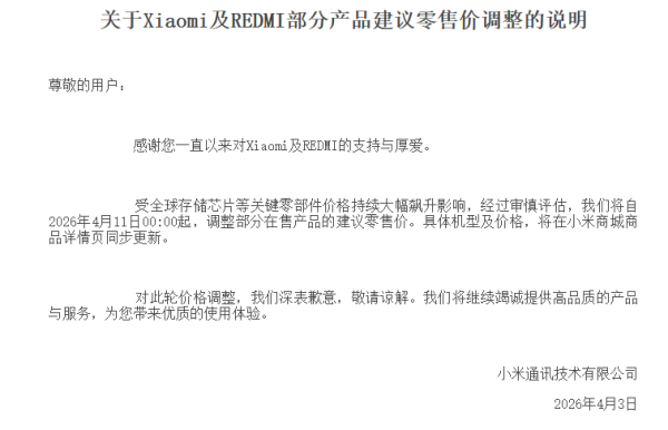 4月3日,小米为了应对存储芯片价格上升带来的成本压力,宣布于4月11日起对数款在售商品进行调价。