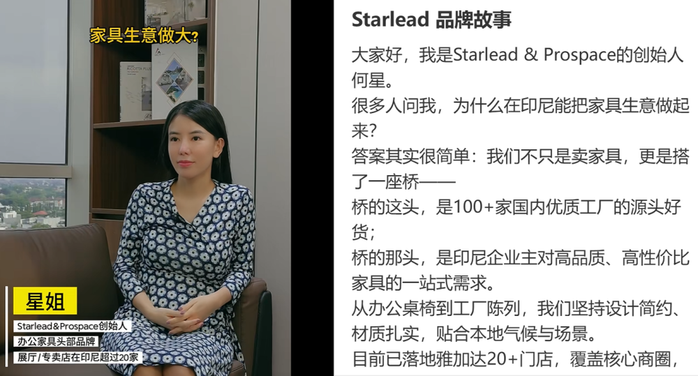 在社交媒体平台上,何星在视频中透露,2023年9月Starlead Group在印尼正式成立,精选了国内100多家优质工厂,整合源头好货,精准对接印尼企业主需求,一站式解决办公室全套桌椅、工厂配套家具等。