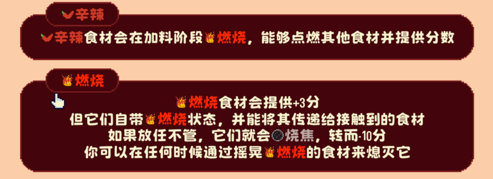 「辛辣」食材会让周围的食物燃烧,最初会带来加分,放任不管就会烧成焦炭。