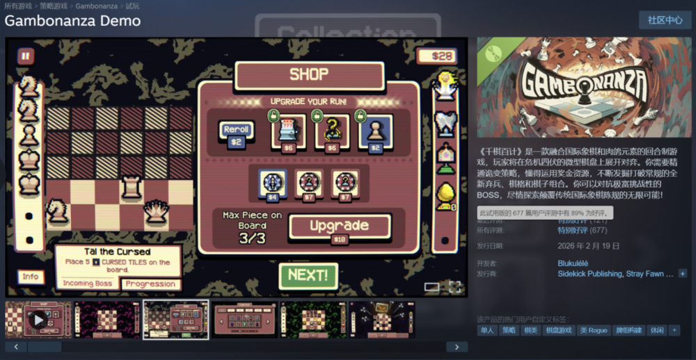 150余种Gambit对标小丑牌的Joker,比如用兵吃子后对方跳过一回合,或者升变的兵直接变成国王。和前面几款产品不同的是,Gambonanza的棋盘对面有一个AI在走棋。你的构筑不只是为了冲分,还要应对对手的反应,策略空间多了一个博弈维度。