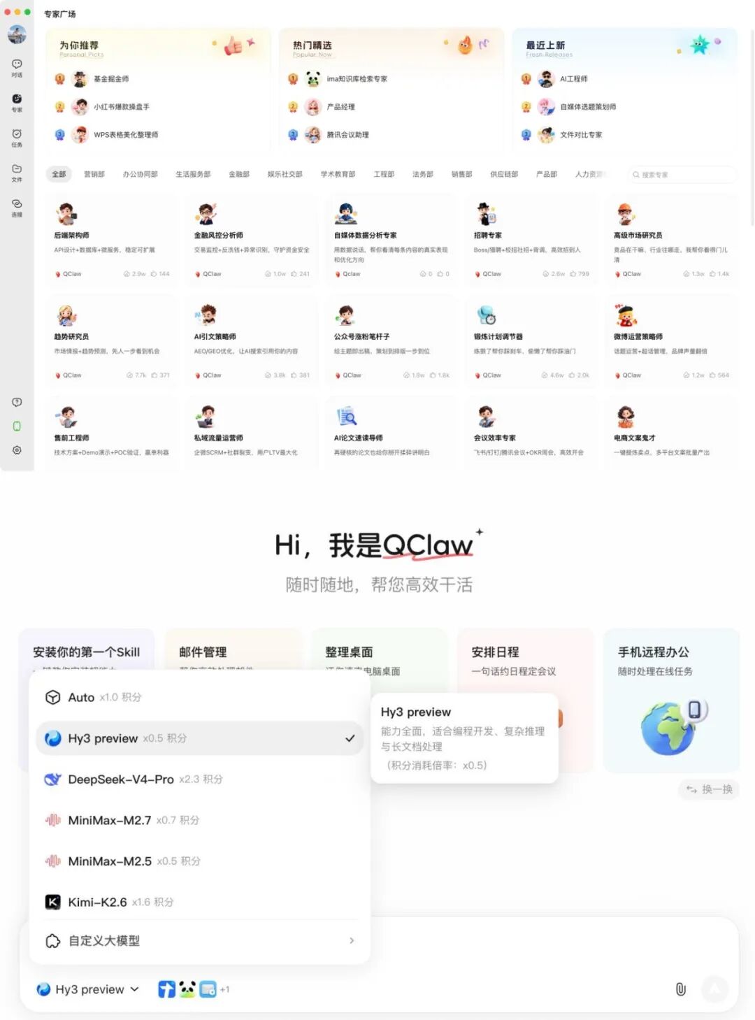 腾讯 QClaw 昨日宣布版本大升级,新版本(V0.2.14)引入 Hermes 框架支持、「灵感广场」全面升级为「专家广场」、底层大模型开放自由切换,微信小程序、连接器等周边能力也同步强化。「灵感广场」全面升级为「专家广场」,上线超 100 个 AI 智能体专家,覆盖内容创作、数据分析、代码开发等场景,底层能力从 Skill 升级为完整 AI 智能体架构,用户零门槛直接调用;行业率先支持 Hermes Agent 内核,与原有 OpenClaw 内核并行运行(目前支持 macOS),用户可按任务场景灵活切换;允许用户自由切换模型,已接入 Hy3 preview、DeepSeek-V4 Pro、KIMI-K2.6、GLM-5.1 等最新大模型;微信小程序支持语音远程操控、文件共享,云端用户可一键绑定 Lighthouse 上的 AI 智能体实例,实现本地与云端无缝切换;连接器新增百度网盘、携程、飞猪、腾讯新闻四大平台;基于腾讯文档的 AI 智能体团队协作功能同步上线。蚂蚁灵光将世界模型搬上移动端,一图即可生成可交互 3D 场景