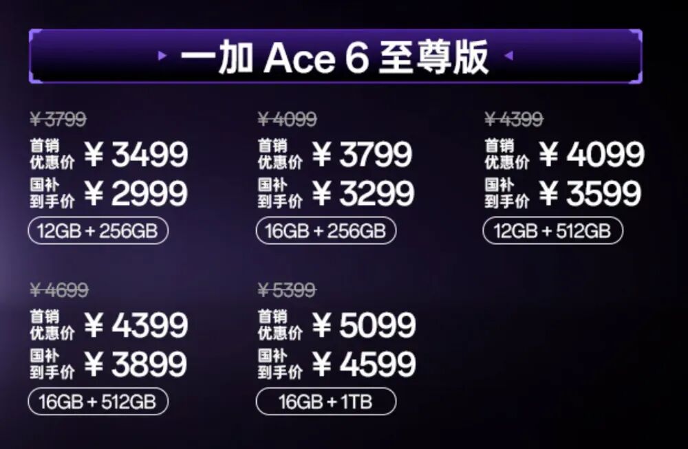 今晚,一加举办新品发布活动,正式推出了全新的一加 Ace 6 至尊版手机。延续旗舰设计语言,全新金属魔方Deco带来扁平化金属阵列设计,「热隔断」金属中框配合旗舰超大R角设计。耐用性上,一加 Ace 6 至尊版支持 IP66/IP68/IP69/IP69K满级防尘防水。王牌觉醒采用 3D 立体刻光工艺与叠层图案镀膜技术,塑造独特的ACE觉醒纹设计。金属风暴则采用丝绸玻璃工艺,叠加「钻石微闪层」,以纳米级蚀刻打造金属钛色光泽。核心搭载天玑 9500,出厂写入一加自主研发的行业首个芯片级游戏技术全新一代风驰游戏内核。带来游戏主机级渲染能力。配备旗舰同款冰河散热系统。一加 Ace 6 至尊版支持165超高帧游戏运行,带来165 无限满帧体验,且拥有超高1% Low帧表现。一加 Ace 6 至尊版配备6.78 英寸165Hz 超高刷东方屏,硬件级低蓝光、3840Hz 超高频PWM 调光,AI护眼功能,通过德国莱茵TÜV小金标护眼 5.0认证。还搭载了旗舰同款超声波指纹技术,配有旗舰同款晶盾玻璃,支持雨水触控2.0、手套模式。内置8600mAh冰川电池,支持120W 超级闪充。首发全新自研的OPPO冰川电池聚能芯片,支持旁路供电。前置 1600 万像素自拍摄像头,后置搭载 5000 万像素大底旗舰主摄、800 万像素超广角摄像头组合,搭配 OPPO 旗舰影像算法。一加 Ace 6 至尊版首销优惠价,12GB+256GB 版本3499元、16GB+256GB 版本3799元、12GB+512GB 版本4099元、16GB+512GB 版本4399元、16GB+1TB 版本5099元。行业首款触按融合射击游戏专属手柄。在不改变玩家原有操作习惯的前提下,带来区别于外挂肩键、拉伸手柄和传统手机肩键的全新操控方案。采用人体工学握把,专为射击游戏握持习惯设计,配备电竞级微动机械开关,响应速度1.8ms。还支持按键映射自定义功能,自定义自由度高、技能动作覆盖广。手柄内置电竞天线,并支持磁吸散热外设等专业电竞拓展。一加枪神游戏手柄,零售价449元,购买一加 Ace 6至尊版,加购一加枪神游戏手柄可享50元优惠。另外还发布了一加 Buds Ace 3,55dB旗舰降噪,54小时长续航,内置FPS游戏专属音效,单元振幅提升100%;支持滑动调节音量、AI同声传译和面对面翻译等功能。综合来看,全新的一加 Ace 6 至尊版主打游戏性能体验。结合参数规格和定价,大家感觉如何?iPhone18Pro机模曝光,库克反思其15年CEO任期