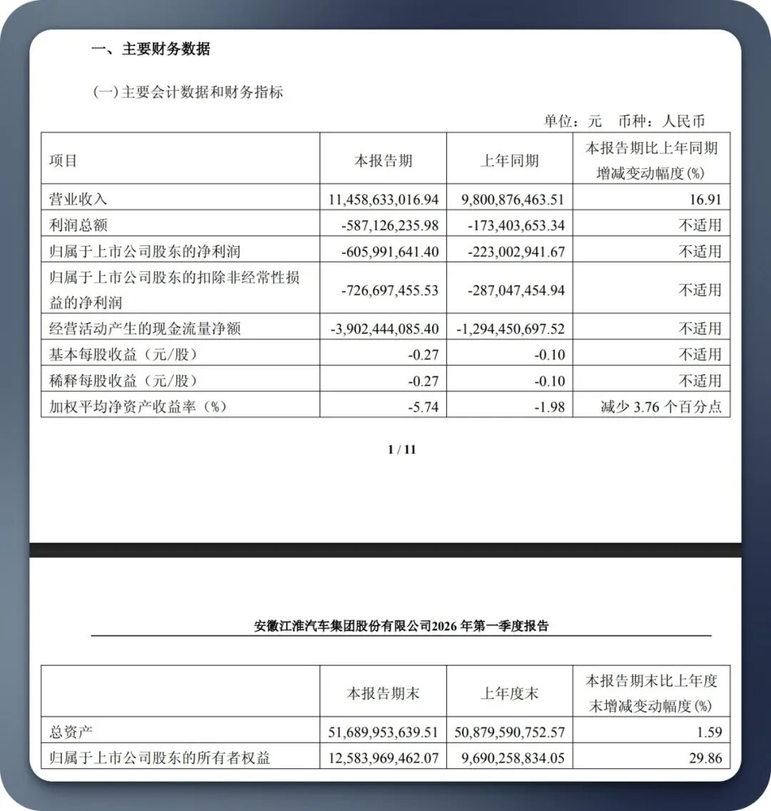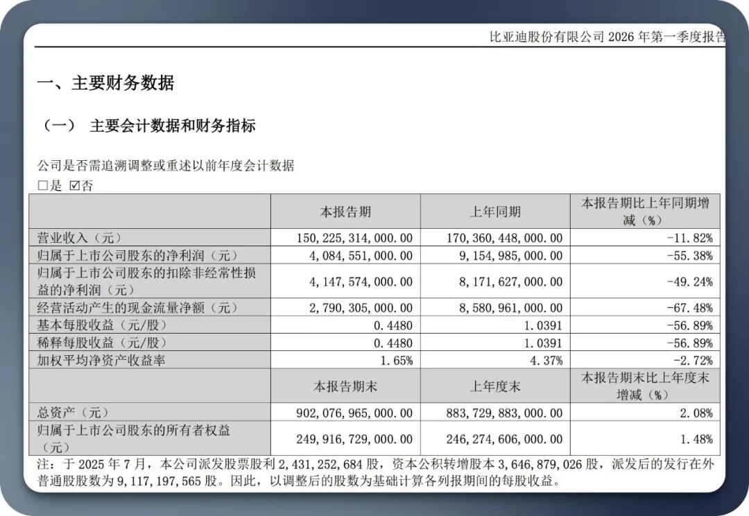 比亚迪昨日发布 2026 年第一季度报告,显示今年 1 至 3 月实现营业收入 1502.25 亿元,同比下降 11.82%;归属于上市公司股东的净利润 40.85 亿元,同比大降 55.38%;扣非净利润 41.48 亿元,同比下滑 49.24%。营业成本 1219.74 亿元,同比下降 10.43%;毛利率约 18.8%,较去年同期 20.1% 收窄约 1.3 个百分点;研发费用 113.44 亿元,同比减少 20.25%,内部开发支出期末余额 82.85 亿元,较年初增长 38.75%;经营活动产生的现金流量净额 27.90 亿元,同比骤降 67.48%,主要系销售商品收到的现金减少所致;基本每股收益 0.4480 元,同比下降 56.89%;加权平均净资产收益率 1.65%,同比下降 2.72 个百分点;总资产 9020.77 亿元,较去年年末增长 2.08%。其一,财务费用由去年同期的收益 19.08 亿元转为支出 20.99 亿元,变动幅度达 210.04%,原因是汇兑方向逆转 —— 去年同期为汇兑收益,今年一季度则录得汇兑损失;其二,投资收益同比骤降 87.68% 至 0.86 亿元,主要系以摊余成本计量的金融资产终止确认损失大幅增加所致。两项合计对利润形成显著拖累。卖得更多、亏得更深:江淮汽车今年一季度营收增 17% 但净亏损扩至 6 亿