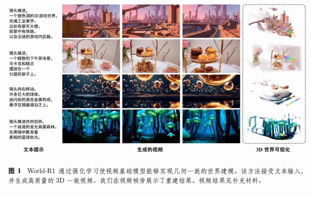 昨天,微软研究院(MSRA)与浙江大学联合团队发布文生视频模型训练框架 World-R1,通过强化学习让文生视频模型学会 3D 几何一致性,无需修改模型架构,不依赖 3D 数据集。当前视频生成模型在镜头大幅移动时,常出现物体变形、消失等「几何幻觉」问题。根据团队发布的论文,World-R1 的解法是将 3D 一致性约束转化为强化学习的奖励信号:生成视频后,用 Depth Anything 3 重建 3DGS 场景并从新视角渲染;将重建误差、镜头轨迹偏差、新视角可信度(Qwen3-VL 评分)合并为奖励信号;通过 Flow-GRPO 算法反馈给视频模型,令其逐步内化 3D 规律;每训练 100 步插入一轮「动态微调」,防止几何约束压制人物运动等动态效果。基座模型为开源的万象 Wan 2.1(1.3B 和 14B),训练数据仅约 3000 条由 Gemini 生成的纯文本 prompt。量化结果上,3D 一致性(PSNR)Small 版提升 10.23dB、Large 版提升 7.91dB,VBench 通用视频质量同步提升。25 人盲测中,几何一致性胜率 92%,整体偏好胜率 86%。📖 论文全文:arxiv.org/abs/2604.24764企业微信上线「记录面聊」:声纹识别自动转写,AI 生成会议总结和待办