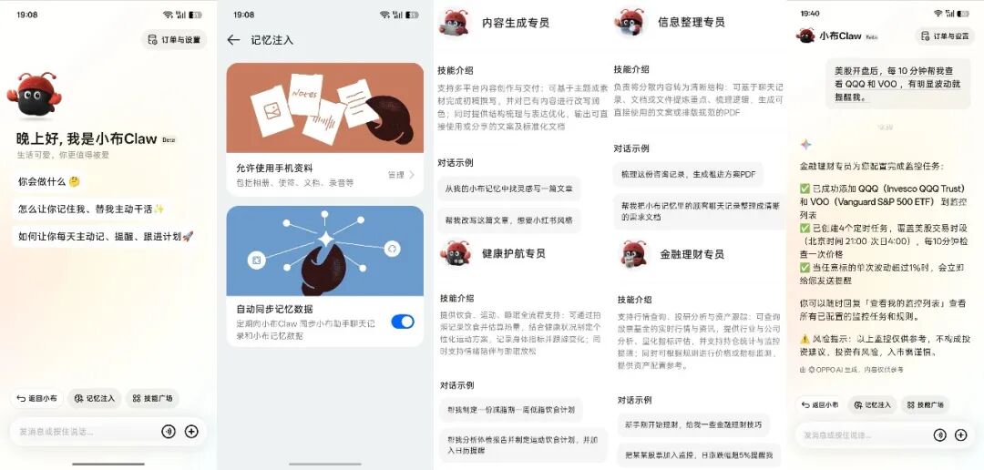 昨天,ColorOS 设计总监陈希在微博公布 AI 智能体产品「小布 Claw」的最新进展,产品目前处于内测阶段,主打「更简单、更安全、更懂你」。小布 Claw 可直接同步小布助手已有的记忆数据,用户无需从零配置即可上手。「记忆注入」功能支持接入相册、便签、文档、录音等本地资料,并可开启自动同步选项,定期将小布助手聊天记录与记忆数据同步至小布 Claw。一键开通,预装日常生活、理财、健康等多场景核心能力;技能广场涵盖内容生成、信息整理、健康护航、金融理财四大垂直专员;影翎 A1 无人机春季大更新:AI 一键成片升级,新增语音助手与全向避障