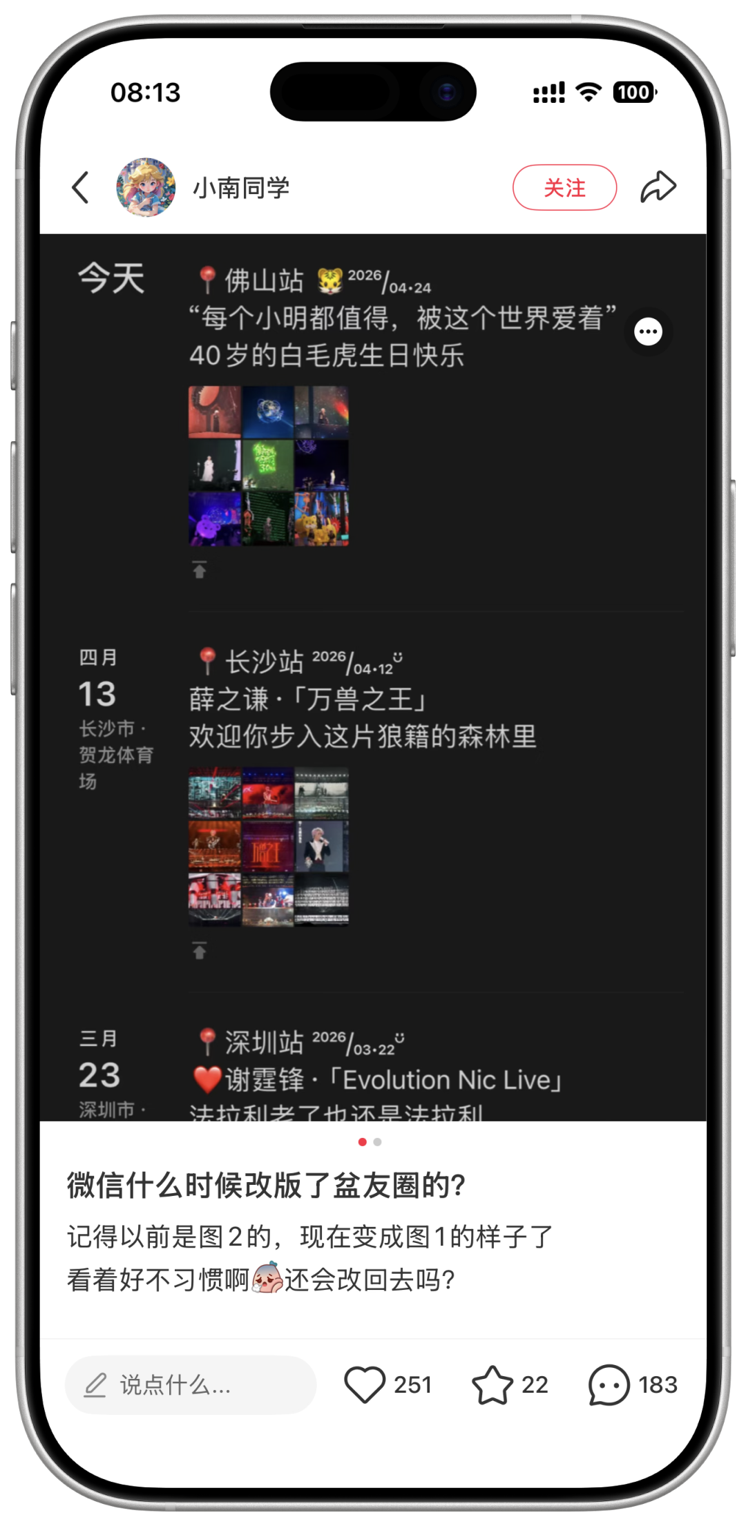 近日,网友「小南同学」在小红书分享称,微信朋友圈针对部分 iOS 用户灰度推送了一次界面改版,目前主要覆盖 iOS 8.0.71 及以上版本。文字与图片的排列方式由原来的「右文左图」改为「上文下图」,发布日期的显示格式也同步精简。新增的「朋友圈相册」入口支持按年 / 月 / 日缩放浏览历史动态,交互逻辑与 iOS 系统相册类似,具备时间轴浏览功能。另据鞭牛士报道,部分用户还发现新版中「提醒谁看」的表述已更改为「和谁一起」。DeepSeek V4-Pro API 2.5 折优惠延长至 5 月底