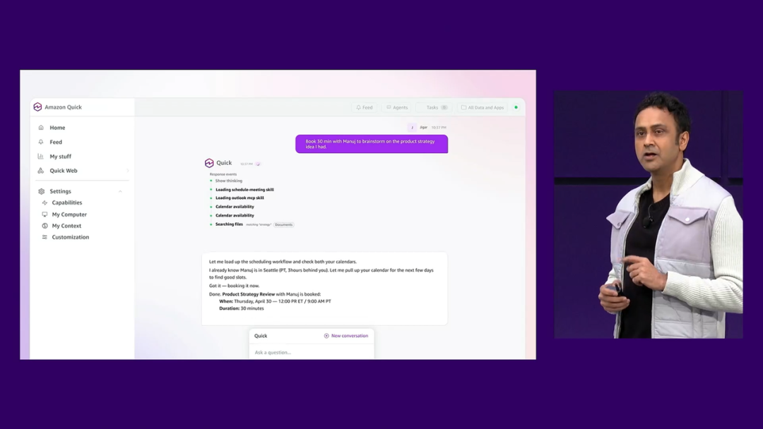 「SaaS 末日」这个词,最近在科技圈的流传速度不亚于任何一条爆款新闻。不少硅谷分析师都在疯狂输出焦虑,大意是说 AI Agent 这么猛,现有的企业软件如果不推倒重来,马上就要被拍死在沙滩上。这股风声甚至直接「吹绿」了几家老牌 SaaS 公司的股价。说实话,每次听到「颠覆」、「末日」这种词,大家可能都会下意识觉得是炒作。但在今天凌晨召开的 「What's Next 」新品发布会上,亚马逊云科技 CEO Matt Garman 给出了一个挺中肯的定调:末日论确实夸张了点,但如果你指望靠着原来那个老旧系统,随便加个 AI 聊天框就能应付差事,那才是真的危险。真正的转型发生在更深处。当工作流、数据结构、应用架构和交互界面都跟着 Agent 的能力重新设计,企业软件才算完成了这次重建。这也是亚马逊云科技(云计算一哥)这次所有新产品的底层逻辑。有趣的是,在官宣与微软「分手」之后,OpenAI CEO Sam Altman 也通过视频的方式给亚马逊云科技站了台,官宣 ChatGPT 最强模型拎包入住亚马逊云科技,并达成深度战略协作。而无论是面向个人和团队的 Amazon Quick,还是供应链、招聘、医疗三个垂直场景的 Connect 新家族,再到与 OpenAI 的深度合作,指向的都是同一个问题的答案:以 AI Agent 为起点,SaaS 未来应该长什么样。来,咱们做个深呼吸,回想一下你今天极其崩溃的上午:领导在企业聊天工具上吼了一嗓子模糊不清的需求,你虎躯一震,赶紧切到公司的 CRM 系统里疯狂扒拉客户数据;接着打开邮箱,在一堆垃圾邮件里翻找上周的进度;最后在本地新建一个文档,把这些零碎的信息一点点拼凑、复制、粘贴。我们的办公软件越装越多,但它们之间是互相割裂的、老死不相往来的。而你,就是那个在各个信息孤岛之间来回奔波的「肉身搬运工」。为了解决这个痛点,亚马逊云科技推出了全新升级的 Amazon Quick 桌面版(目前处于预览阶段)。它的核心设计逻辑是将分散的信息网收拢,在系统后台构建一张关于人员、项目、决策和事务动态的知识图谱,让上下文主动跟着人走。每一次使用,Amazon Quick 都在默默积累你处理的文档、项目的 Deadline、频繁沟通的同事以及升级处理的紧急邮件。基于这些沉淀,它可以主动提示你当天的优先事项。打个比方,你准备下午跟一个重要客户开会。如果是以前,你得花两小时找资料。现在,你只需要给 Quick 甩一句:「帮我准备一下下午见王总的材料。」Amazon Quick 会迅速认出「王总」是哪个项目的,然后去系统里把王总团队之前的历史案例扒出来,接着去你的本地 D 盘里偷窥……哦不,读取最新的产品路线图,再结合 Slack 里同事昨天的吐槽记录。几分钟后,一份逻辑严密、排版精美的 PPT 就糊在了你脸上。这还没完。同样是这堆信息,你让它变身,它就能立刻吐出一份摘要邮件,或者一份 Excel 营收表。如果王总说「改天聊」,Amazon Quick 甚至能自动查对你们俩的日历,算好时差,把新的会议邀请发过去。全过程,你只需要在一个对话框里当个无情的监工。美国最大的互助人寿保险公司 New York Life 的机构寿险业务 CTO David Gregorat 的评价一语中的:「Quick 让我们重新想象了整个运营方式。原来需要拉多份报告、等分析师处理的答案,现在团队里任何人都能通过对话式 Agent 直接获取。」至于这效率有多夸张?亚马逊云科技 Agentic AI 商业化副总裁 Jigar Thakkar 透露了一组极其夸张的数据:宝马、3M、亿滋这些大厂内测后,部分流程的处理时间直接被一刀砍了 80%。3M 的销售代表每周甚至能凭空多出 5 个小时的摸鱼……啊不,思考时间。如果说 Amazon Quick 是给你个人加了个三头六臂的效率外挂,那 Amazon Connect 家族的扩编,就是亚马逊云科技尝试重塑企业核心流程的重头戏。亚马逊云科技提出了一套叫「Humorphism(人态设计)」的理念。听起来有点玄乎,说白了就是:AI 不能只是个冷冰冰的执行机器,它得像个人类好队友一样,懂轻重缓急,能顺畅沟通。基于此,Amazon Connect 家族不仅将原有的客服产品升级更名为 Amazon Connect Customer,还针对垂直场景发布了三款 Agentic AI 解决方案。Connect Decisions:让供应链规划师从救火转向决策供应链出现中断后,企业通常需要超两周时间处理,期间伴随大量资金损耗和违约风险。Connect Decisions 针对这一痛点,为规划师配备了全天候在线的 AI 队友。它的底层并非空中楼阁,深度集成了亚马逊 SCOT 团队(负责管理亚马逊全球 4 亿 SKU 需求的核心部门)所研发的预测模型。面对没有历史数据的新品,它能自动关联相似品类生成需求计划。当监控到关键供应商交货落后(例如预计 10 天内导致两个配送中心断货)时,它会将传统软件每天产生的数千条警报收敛为几条最高优先级的例外事项,并直接给出两套附带预期影响、成本和置信度评分的处置方案。规划师手动选择并说明原因后,系统会吸收这条判断逻辑,供未来参考。Connect Talent:25 万人招聘经验化身「赛博面试官」亚马逊云科技在 2025 年旺季期间单季招募了 25 万名季节性员工,Connect Talent 便是这套庞大招聘经验的产品化。系统能根据职位描述自动解析能力需求,生成面试题和评分标准(需人工审核)。系统最大的特点是能对模糊回答进行追问,确保评估的结构一致性。原本需要数周完成的 80 场初筛面试,现在几天即可完成。系统最终向招聘方展示的是隐去个人身份信息的标准化能力评分,用数据支撑最终的录用决定。Connect He