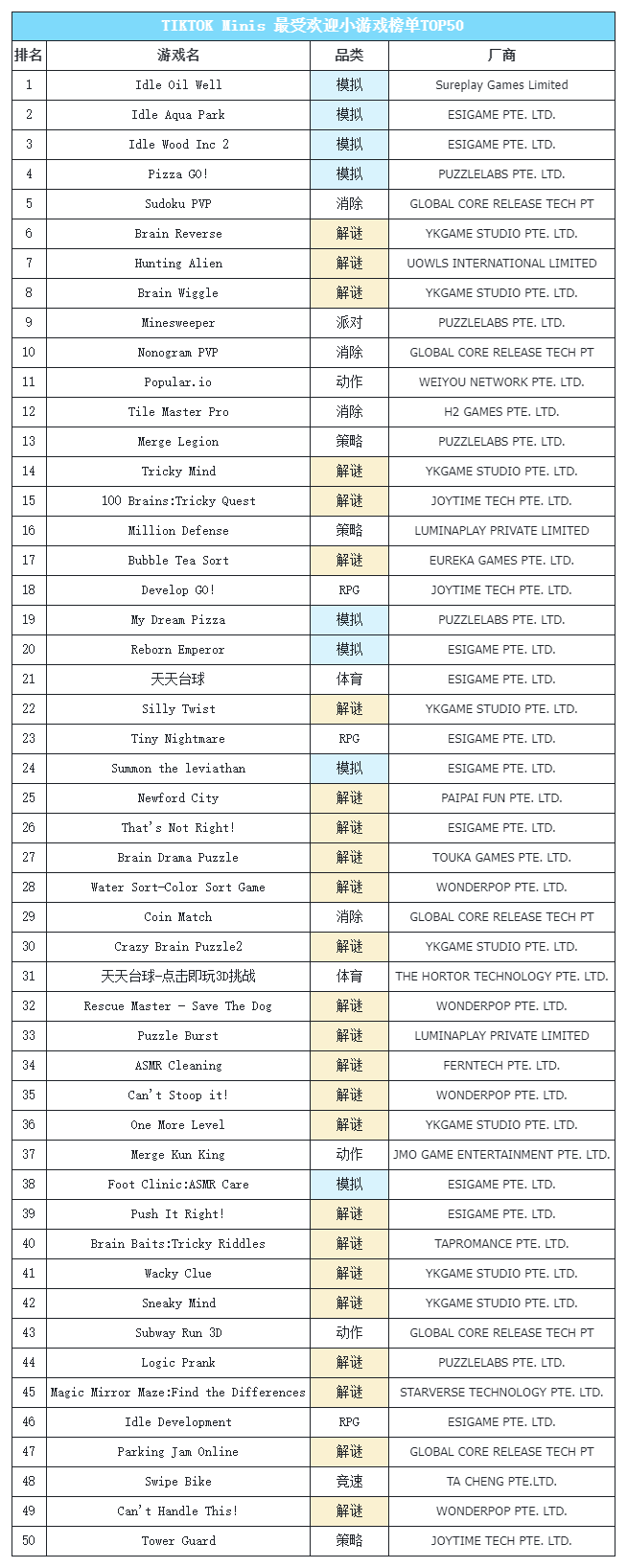 拉通榜单来看,我们很容易发现一些规律,比如在TikTok小游戏榜单前列,模拟和解谜类游戏的占比非常高。