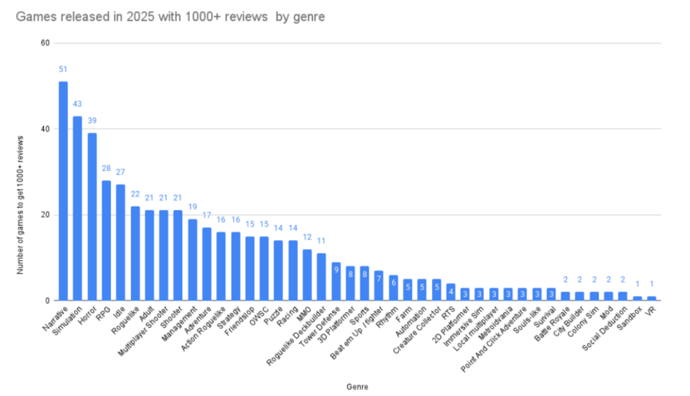 2026年初,Steam营销专家Chris Zukowski写过一篇文章《What the hell happened in 2025》,尝试用数据来回答“为什么Steam上大量看起来还行的独立游戏很快就消失在了大众视野”这个问题,文中列举了最有利于长线积累销量的品类,比较反直觉的是,不少公认很火的品类反而不在榜单上。