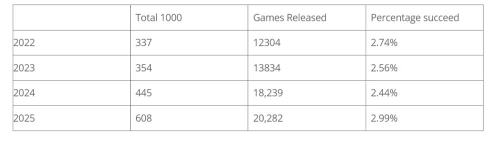 根据海外Steam营销从业者统计,2025年Steam发布了20282款游戏,有608款游戏至今累计的评论突破1000条,接近总数的3%,是最近4年中最高的一年,这些游戏大部分是独立游戏,就是说长线销售的独游从比例上变多了。