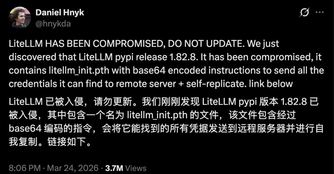 GitHub 上四万颗星,日均下载 340 万次,几乎是 AI 开发者电脑里都会出现的基础设施。LiteLLM,昨晚被黑了。只要你用过它,或者用了任何一个间接依赖它的工具,你电脑上的东西就会被打包带走:远程连接的私钥、AWS/GCP/Azure 各种云账号、部署平台密钥、加密货币钱包、数据库密码,还有你放在 .env 文件里的所有 API Key。打包好,发走,目的地是黑客提前架好的服务器。不需要