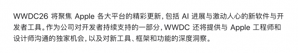 本周,苹果正式官宣全球开发者大会(WWDC)2026 将于北京时间 6 月 9 日在 Apple Park 拉开帷幕。以往 WWDC 的叙事中心,几乎都围绕新一代操作系统展开。这一次,苹果官方直接在新闻稿中宣布将分享「AI 进展」,优先级还比「软件更新」更高。▲ 苹果官方新闻稿当然,这也因为去年的 iOS 26 刚刚用「液态玻璃」完成了一次大更新,今年的 iOS 27 会聚焦于稳定性。但换个角度看