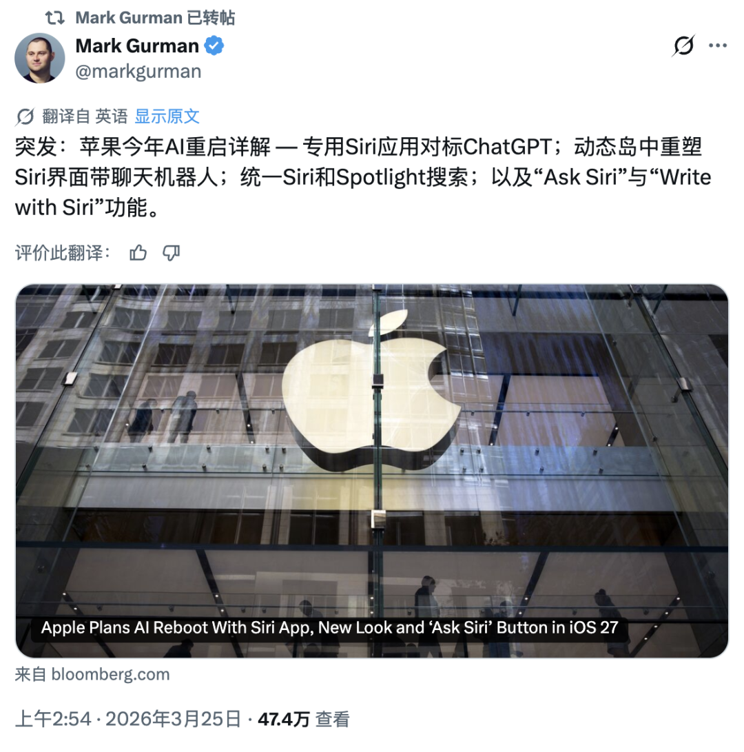 Siri 要有自己的独立 App 了。不是那个按一下电源键蹦出来、说两句就断片的 Siri,是一个长得像 ChatGPT、能聊天、能翻历史记录、能上传文档分析的「全新 Siri」。彭博社记者 Mark Gurman 今天凌晨爆出了一颗重磅炸弹:苹果正在内部测试一款独立的 Siri 应用,代号 Campo,计划 6 月 9 日在 WWDC 上随 iOS 27 一起亮相。如果消息属实,这将是苹果自 2