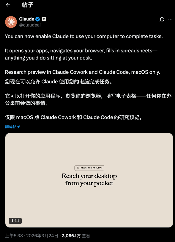 Anthropic 昨晚又「震撼发布」了,从 20 日起,Claude 几乎以两天一个新版本的节奏在迭代,这一次的更是令人瞠目结舌:AI 可以操作你的电脑鼠标了。这个新发布被称为 Dispatch,借助手机调令 Claude 控制电脑。更有意思的地方在于,Dispatch 回答了一个最近被 AI 圈反复讨论的问题:在 AI Agent 的时代,我们还需要 App 吗?Anthropic 的答案是: