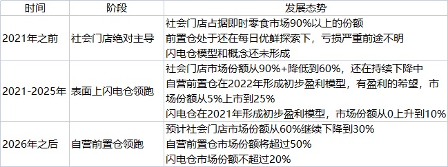本文来自微信公众号: 陈维龙的望远镜 ,作者:陈维龙一、即时零售发展的三个阶段即时零售发展分为2021年之前的社会门店主导期、2021年-2025年的闪电仓领跑期和2026年之后的自营前置仓领跑期。第一阶段大家应该不会有异议,毕竟对比太悬殊了,要不是疫情影响,在社会主流观念里几乎没有即时零售的概念。第二阶段值得细说一下,表面上看是闪电仓领跑,但是从规模、速度、质量来看,前置仓比闪电仓表现更好。为什