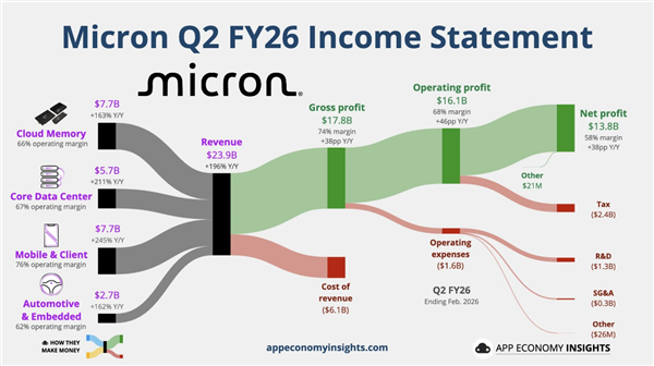 快科技3月20日消息,内存、闪存为代表的存储芯片大涨价愈演愈烈,目前依然没有价格企稳的迹象,三星、SK海力士等公司甚至表态2028、2030年之前都会缺货,这些公司今年仅靠内存涨价就能赚5倍以上的净利润。 全球第三大内存巨头美光日前也发布了业绩炸裂的财报,截至2月26日的Q2财季营收同比增长将近两倍至约239亿美元,非GAAP口径下调整后每股收益(EPS)12.20美元,均明显高于市场预期。 盈利