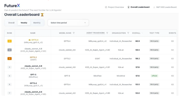 大模型圈,变天了。 2026年3月29日,一份名为FutureX的全球动态评测榜单刷新了成绩。北京中关村学院信息智能团队自主研发的智能体系统Milkyway,以60.9分的绝对优势霸榜! 这个分数有多夸张? 作为对比,由埃隆·马斯克(Elon Musk)旗下xAI打造、曾被寄予厚望的Grok-4,在这份榜单上仅拿到了25.9分。Milkyway的得分是它的一倍还多(Grok-4曾拿下该项目的首期冠