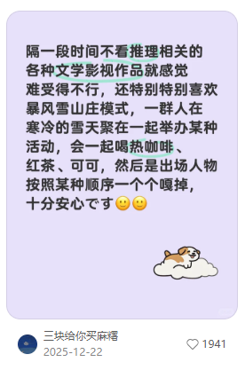 本文来自微信公众号: BB姬 ,作者:小熊猫1933年,美国推理作家埃勒里·奎因在小说《暹罗连体人之谜》中,开创性地将“因山火被困的封闭山庄”作为故事舞台。至此,一个被后世无数悬疑推理作品百闻不厌的设定诞生了,它就是——暴风雪山庄。这类作品,通常会构建一个极端封闭的空间。在此背景下,相继遇害的成员,让幸存者彼此之间的怀疑与猜忌酝酿出人性最卑劣的一部分;而外部无法介入的封闭环境在进一步放大恐惧的同时