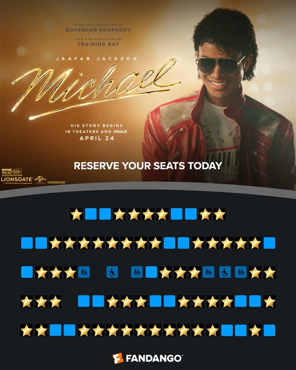 音乐传记片《Michael》定于4月24号公映,北美发行方狮门影业安排了点映场以预热票房并为影片造势。 点映定于22号(周三)晚间开启,只此一晚,隔天便是周五公映日。包括点映在内的预售票房创下音乐传记片新纪录——统计数据显示该片前三天将取得5000万美元票房,首周票房超过6000万美元,胜过2015年的《冲出康普顿》(6000万美元)以及2018年的皇后乐队传记片《波西米亚狂想曲》(5100万美元