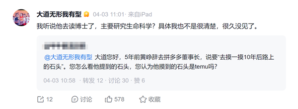 快科技4月5日消息,很多人好奇,拼多多创始人黄峥辞任董事长后,到底干什么去了。 近日,知名投资人段永平的最新爆料,或许给出了答案。 有网友在雪球平台向段永平提问:5年前黄峥辞职时,说过要“去摸一摸10年后路上的石头”,这块“石头”是不是跨境电商平台Temu? 对此,段永平回复称:“听说他去读博士了,主要研究生命科学?具体情况不是很清楚,很久没见了。” 据悉,黄峥于2021年3月卸任拼多多董事长,当