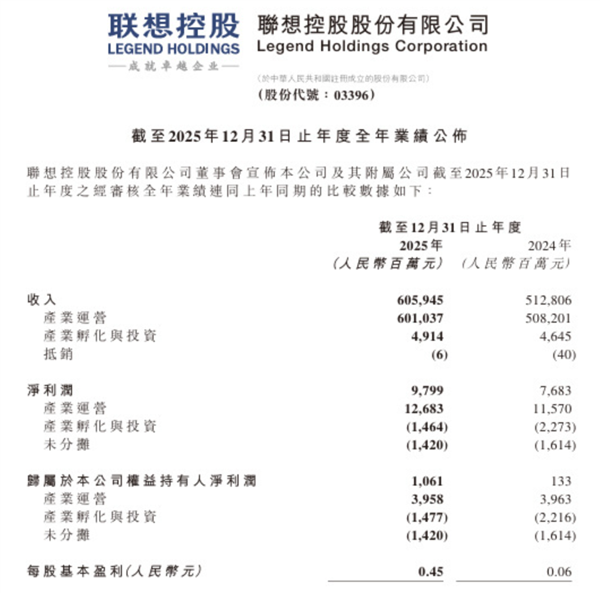 快科技4月4日消息,联想控股近日正式发布了2025年度全年业绩报告。财报显示,联想控股在这一年实现了里程碑式的业绩跨越,年收入规模一举突破了六千亿元大关,展现出极其强劲的发展势头。 根据官方公告数据,联想控股全年总收入达到6059.45亿元人民币,同比增长18%。与此同时,归属于公司权益持有人的净利润达到97.99亿元,同比增长28%,实现了收入与利润的双重高增长。 2025年作为十四五规划的收官
