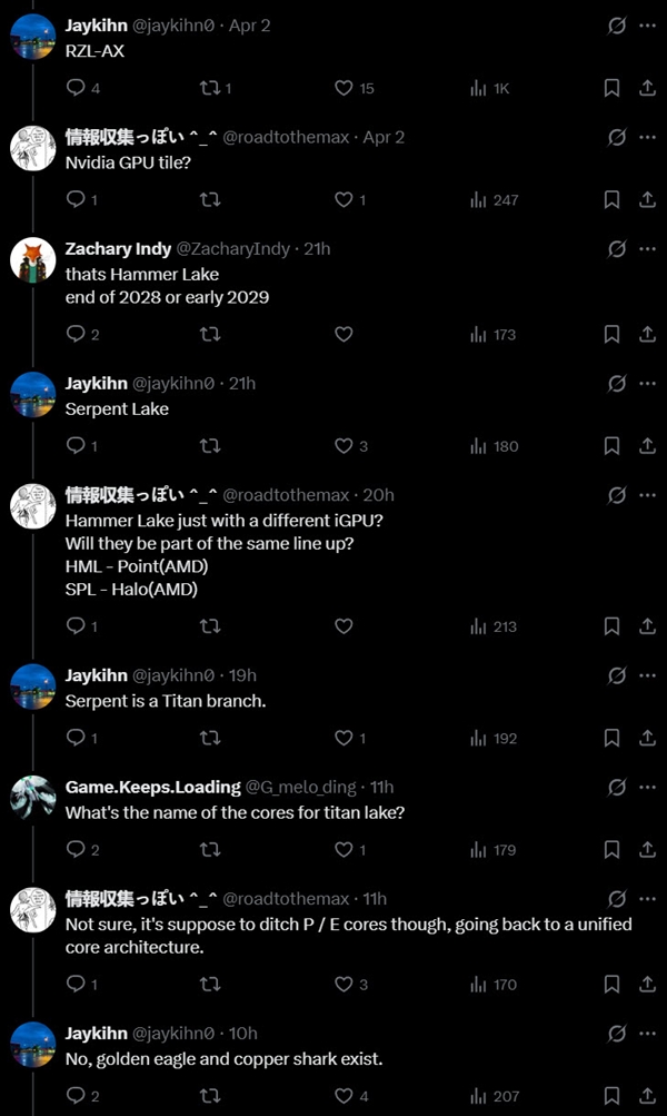 快科技4月7日消息,据Jaykihn透露,Intel Serpent Lake SoC将成为首款集成NVIDIA RTX GPU的Intel处理器,同时下一代P核架构代号"Copper Shark"也被一并曝光。 按照Intel目前的路线图,Razer Lake将是Nova Lake的继任者,预计2027-2028年推出,而Titan Lake紧随其后,Hammer Lake则排在更后面,整体时间