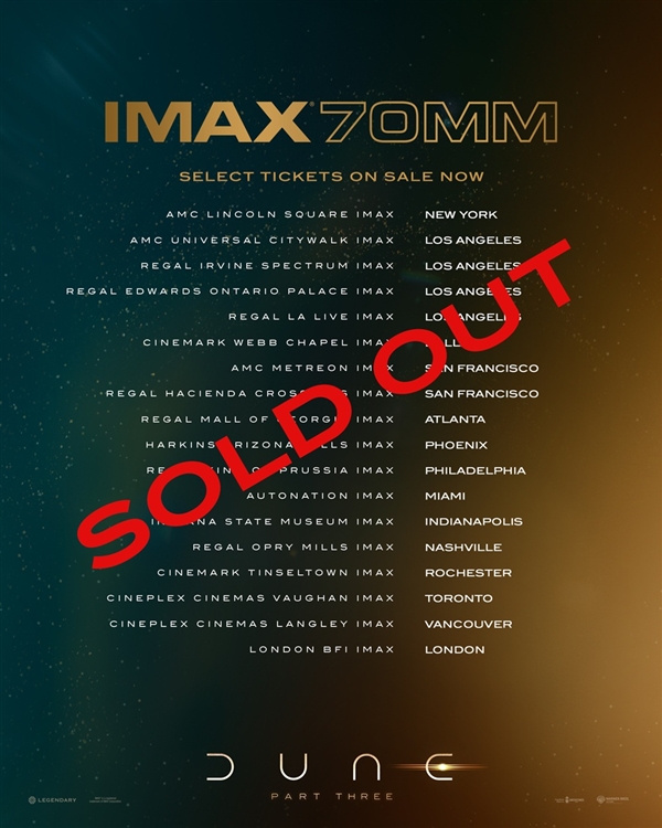 尽管该片要到12月18号才公映,但北美及伦敦十八家影院的70毫米IMAX场次均已售罄。 上述场次的入场券于美东时间6号中午上线开售,数分钟内售完。eBay黄牛随即活跃起来,加价转卖的电影票最便宜也要450美元(非首映,非最佳观影位): 首映皇帝位开价999美元,已售出: 同样是高端场次的好莱坞TCL中国剧院《奥德赛》IMAX首映电影票最贵可以卖到600美元: 售罄场次集中在周末,即周四至周日时段。