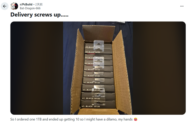 快科技4月2日消息,在内存、固态硬盘价格仍处高位,不少玩家还在为硬件成本头疼的当下,有海外网友却遇上了堪称天上掉馅饼的好事。本只想买一块高端SSD,最终却收到了整整10块,总价值2000美元。 这件事被当事网友发布在Reddit论坛,用户名为u/Bat-Dragon-666的玩家晒出了一整箱NVMe固态硬盘的照片,称自己原本只下单了一块西部数据WD_BlackSN7100SSD,没想到收货时竟收到