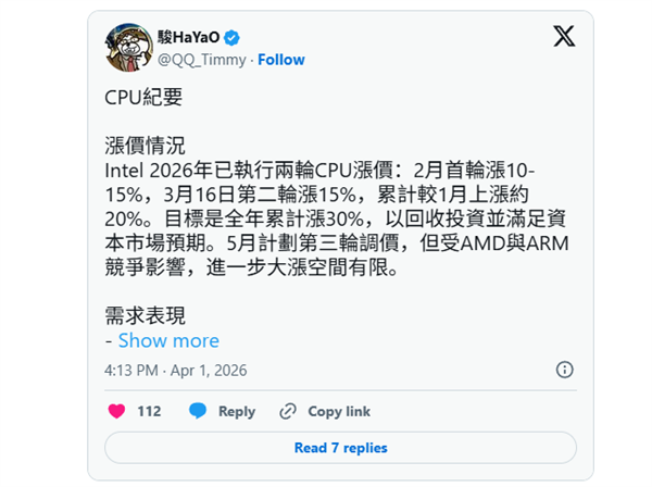 快科技4月3日消息,2026年开年仅三个月,Intel就已连续落地两轮消费级CPU涨价,全年累计涨幅最高将冲击30%。 供应链独家爆料显示,Intel今年2月完成首轮调价,涨幅区间10%-15%。3月16日开启第二轮涨价,再度上调15%,两轮过后CPU价格较今年1月累计上涨约20%。 按照既定规划,Intel将在5月启动第三轮调价,目标完成全年累计30%的涨幅,以此回收产能投资、满足资本市场业绩预