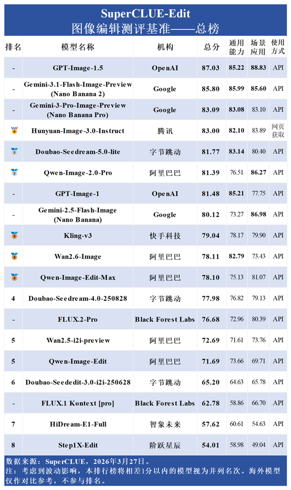 快科技4月4日消息,SuperCLUE日前发布2026年3月中文原生图像编辑测评榜单,本次测评覆盖国内外19个主流图像编辑模型,从通用能力与场景应用两大核心维度展开全面评估。 结果显示,OpenAI的GPT-Image-1.5以87.03分稳居总榜榜首,腾讯Hunyuan-Image-3.0-Instruct以83.00分拿下国内第一,字节、阿里等国产模型紧随其后,形成紧追海外头部的第一梯队。 本
