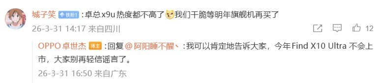 四月一日,OPPO Find系列产品负责人卓世杰正式回应称,今年不会推出名为Find X10 Ultra的机型,同时提醒广大用户谨慎甄别信息,勿轻信未经证实的相关传闻。OPPO与哈苏联合举办的新品发布会定于四月二十一日十九时在成都举行,届时将正式发布Find X9s Pro与Find X9 Ultra两款旗舰新品。其中,Find X9 Ultra聚焦专业影像能力,被定义为“可随身携带的哈苏影像系统