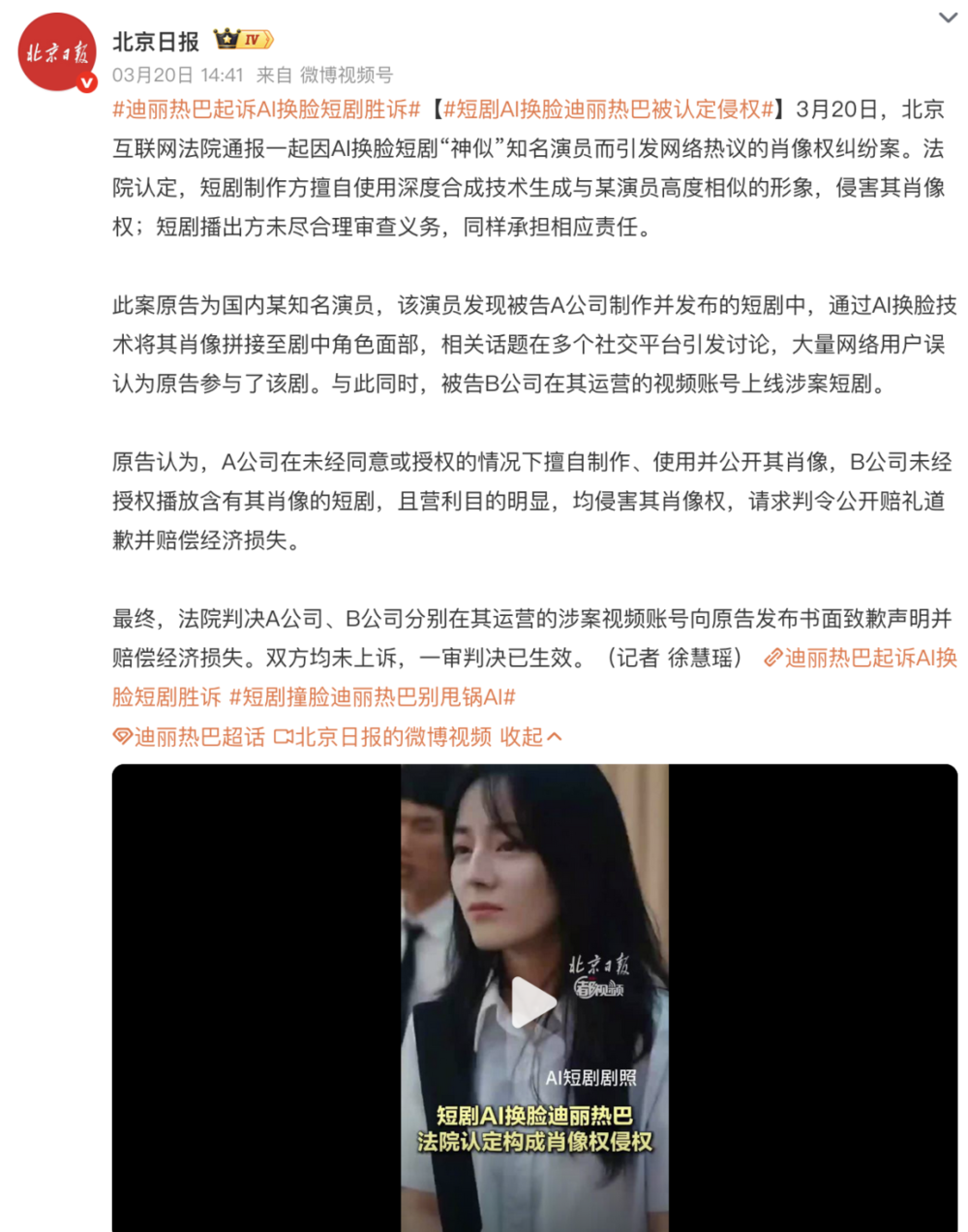 本文来自微信公众号:娱乐资本论,作者:吴艾闻,题图来自:视觉中国近日,北京互联网法院的一纸通报,将迪丽热巴和一家已退市的上市公司扯到了一起。3月20日,国内顶流女星迪丽热巴(原告)将两家微短剧公司告上了法庭。原因令人咋舌:在一部名为《逆骑》(44集、约90分钟)的微短剧中,女主角的脸竟然被AI技术“无缝替换”成了迪丽热巴的模样。这部剧在多个社交平台和视频账号上大肆传播,无数不明真相的粉丝和路人还以