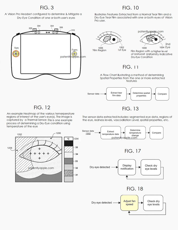 编译/VR陀螺 近日,美国专利商标局公布了苹果公司两项专利申请,专利涉及为Vision Pro及未来可能推出的AR智能眼镜设计的全新干眼症检测系统。 苹果这项最新专利展现了其布局健康监测传感领域的雄心,专利详细介绍了一套通过先进光学与传感技术检测干眼症症状的系统。简单来说,该专利阐述了一种通过监测眼球表面变化与泪膜稳定性来判断干眼症症状的方法。 系统可结合成像传感器、光学检测数据,以及眨眼频率、眼