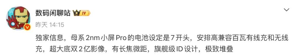 最近,关于新一代的小米数字系列手机再次出现了新的爆料信息。据悉,博主@数码闲聊站 近日的一份消息中提到,“母系2nm小屏Pro的电池设定是7开头,安排高兼容百瓦有线充和无线充,超大底双2亿影像,有长焦微距,旗舰级ID设计,极致堆叠”。其中没有详细的产品系列信息,但相关推测认为其指的是小米 18 Pro。同时这位博主还表示标准版的电池要更大。而在更早之前,同一位博主的爆料中还提到过一款母系2nm大屏