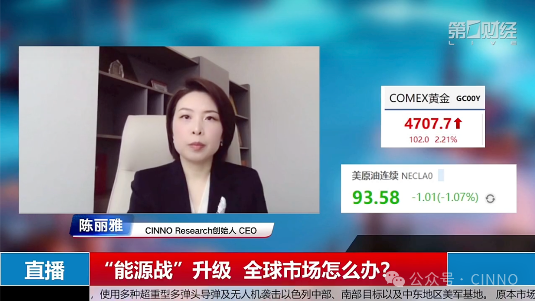 第一财经聚焦中东地缘政治冲突对全球市场的深远影响,举办了一场线上专家访谈。本次访谈围绕霍尔木兹海峡局势对国际油价、全球航运、供应链及资本市场的冲击展开,邀请到多位来自不同领域的专家。其中包括CINNO Research创始人兼CEO陈丽雅,她从产业视角剖析了半导体供应链的挑战与机遇;知名经济学家付鹏,对市场情绪与能源价格走势做出判断;东吴期货贵金属研究员曹可安,解读黄金等贵金属的资产表现;复旦大学